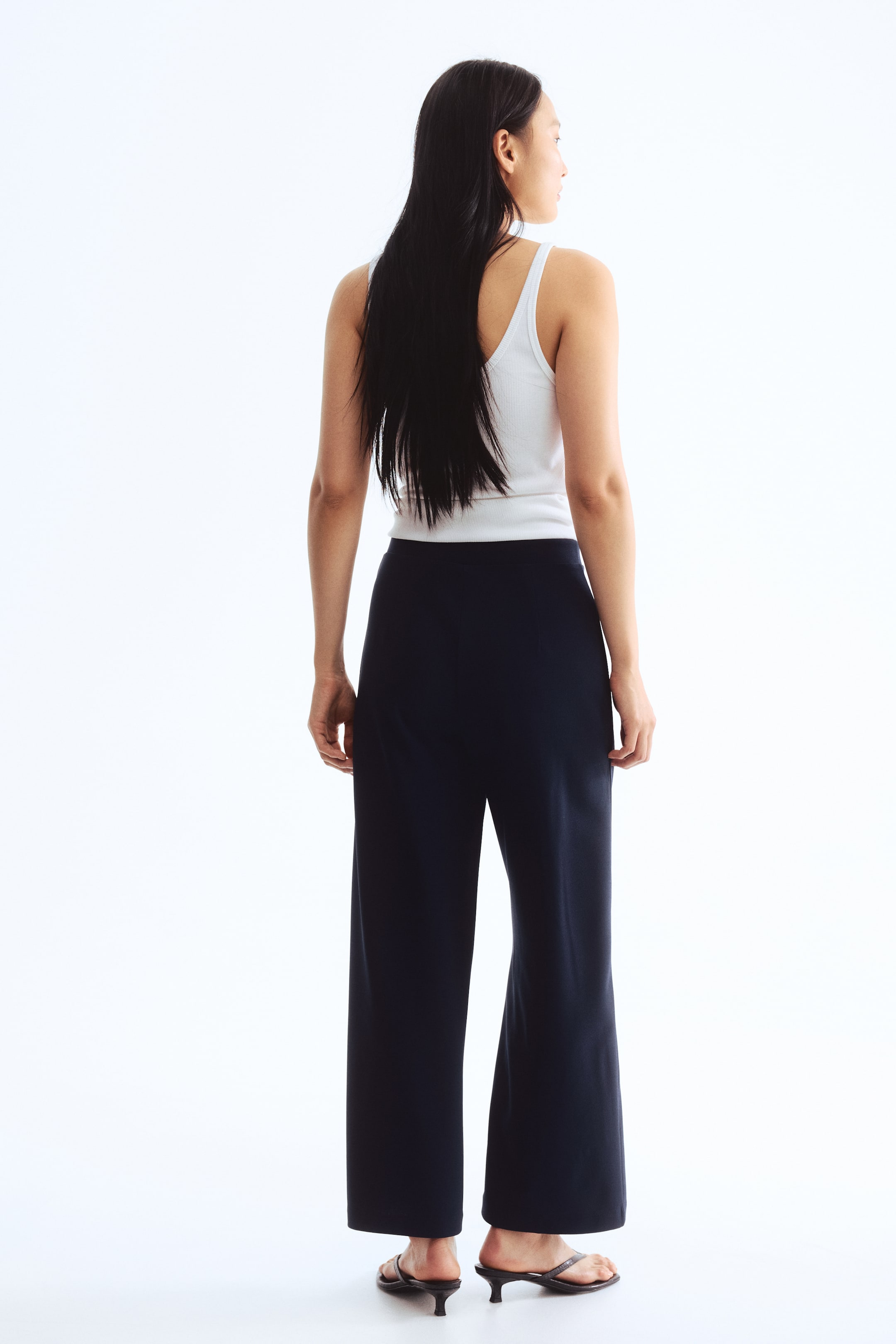 厚平紋長褲,覆面鬆緊帶腰圍,九分褲管,正面有內縫褶線。
