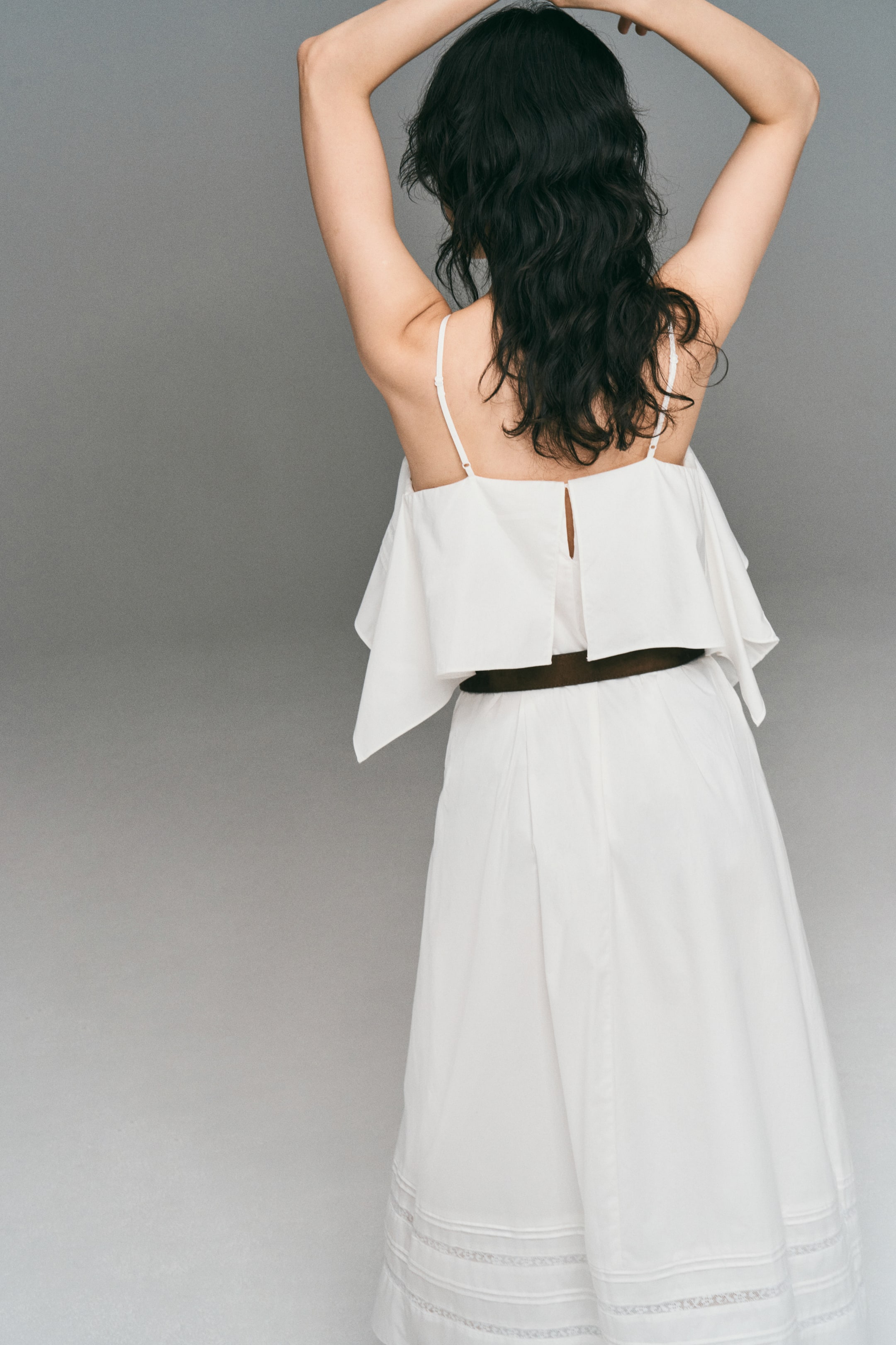 及膝洋裝,棉質平織布料,有蕾絲細節和細褶。細肩帶,平口上部有寬鬆布段,打造層次效果。背面鎖眼開口配單顆鈕扣。有內裡。